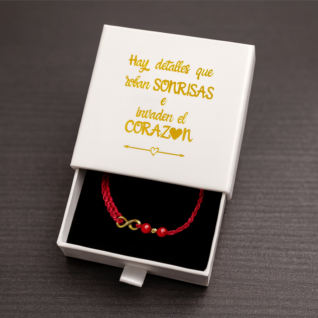 La pulsera de hilo rojo y cinabrio con el símbolo del infinito en oro de 18 quilates es un talismán que simboliza el amor infinito, la abundancia y la protección. Hecha a mano con amor y cuidado, esta pulsera combina la fuerza del hilo rojo y las propiedades del cinabrio para proporcionarle calma, concentración y bendiciones en su vida diaria.
